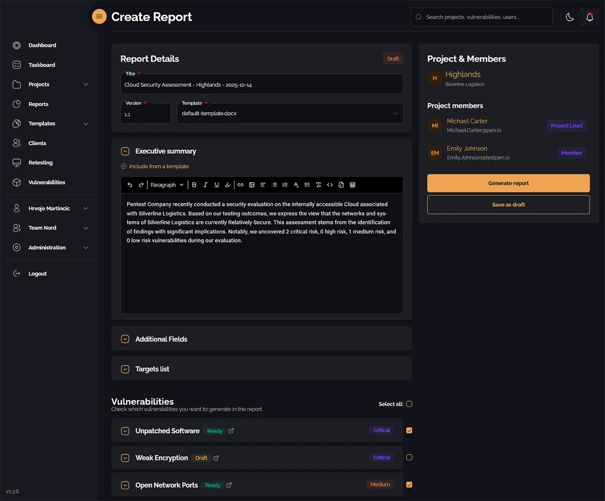 Reports are usually the worst part. You’re tired, you have all this evidence and notes, and then you have to turn it into a document. PentestPad gives you a starting point. It takes your logged issues and builds a rough report. You can edit it, reorder things, add your notes. That alone can save many headaches. When reporting is less stressful, you focus on analysis instead of scrambling to remember what you found.