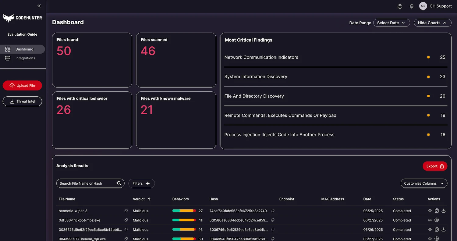 Operationally, CodeHunter delivers a static verdict within minutes while running dynamic analysis in parallel, allowing teams to make fast decisions without relying solely on detonation windows or known-bad indicators.