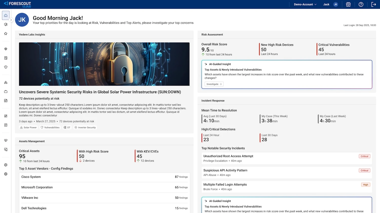 - Immediate clarity on change: Forescout VistaroAI continuously surfaces what changed, new assets, shifting risks, and emerging threats