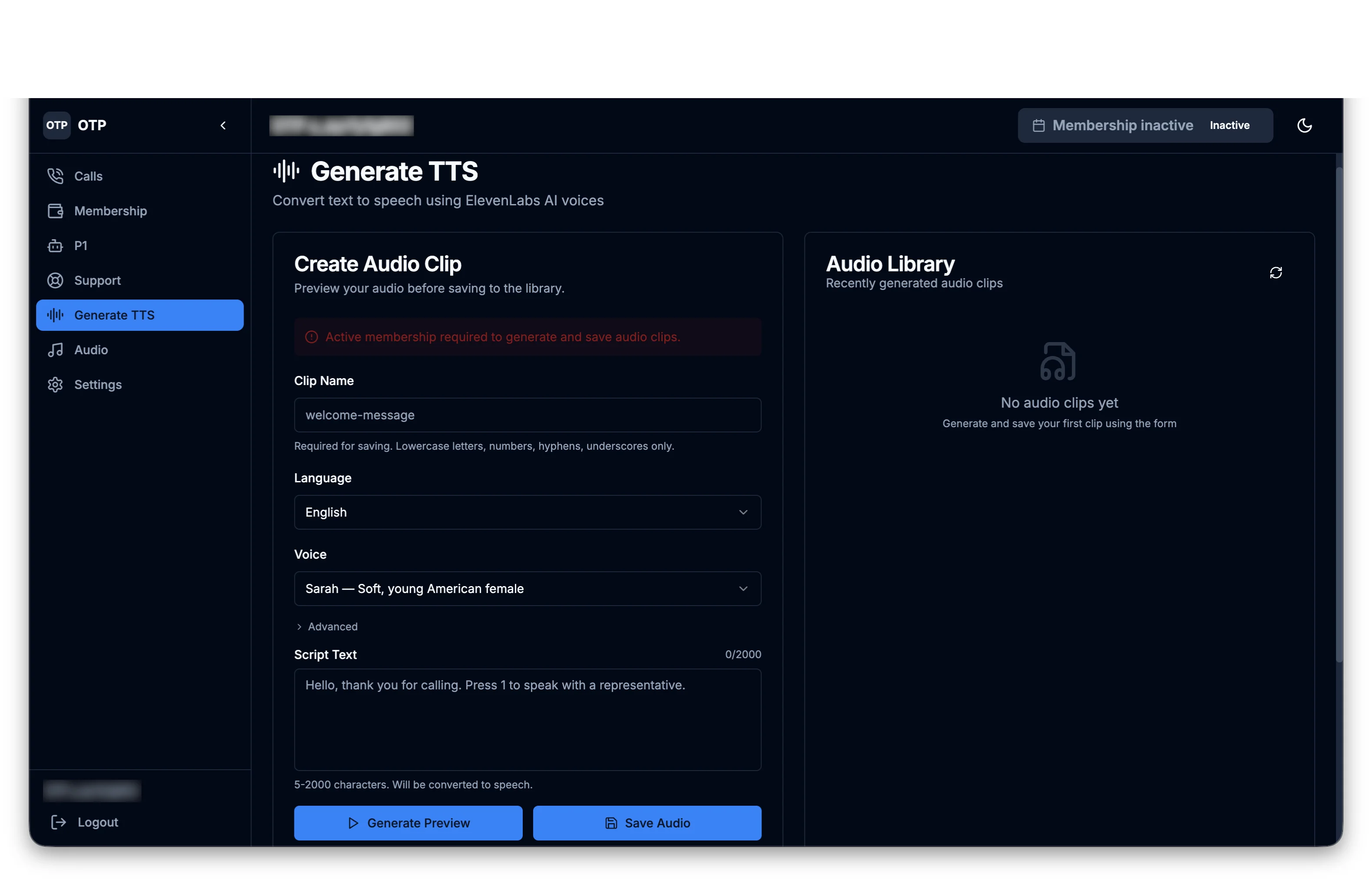 Operators create fake IVR clips via the “Generate TTS” page, and save them in the Audio Library so they can use them during live calls.