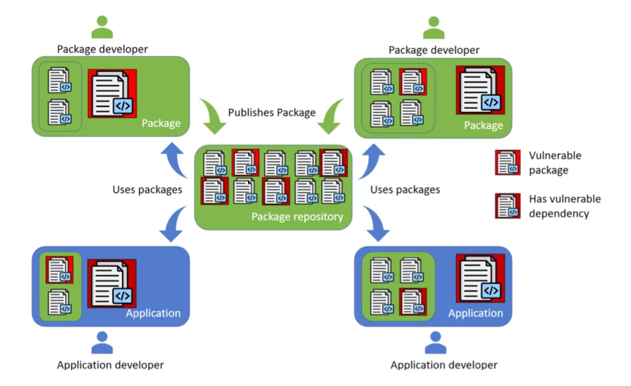 Package managers retrieve libraries from public repositories and integrate them into applications. Tools such as npm, pip and Maven allow teams to add functionality by installing prebuilt components. Applications inherit layers of dependencies that development teams did not write or review.
