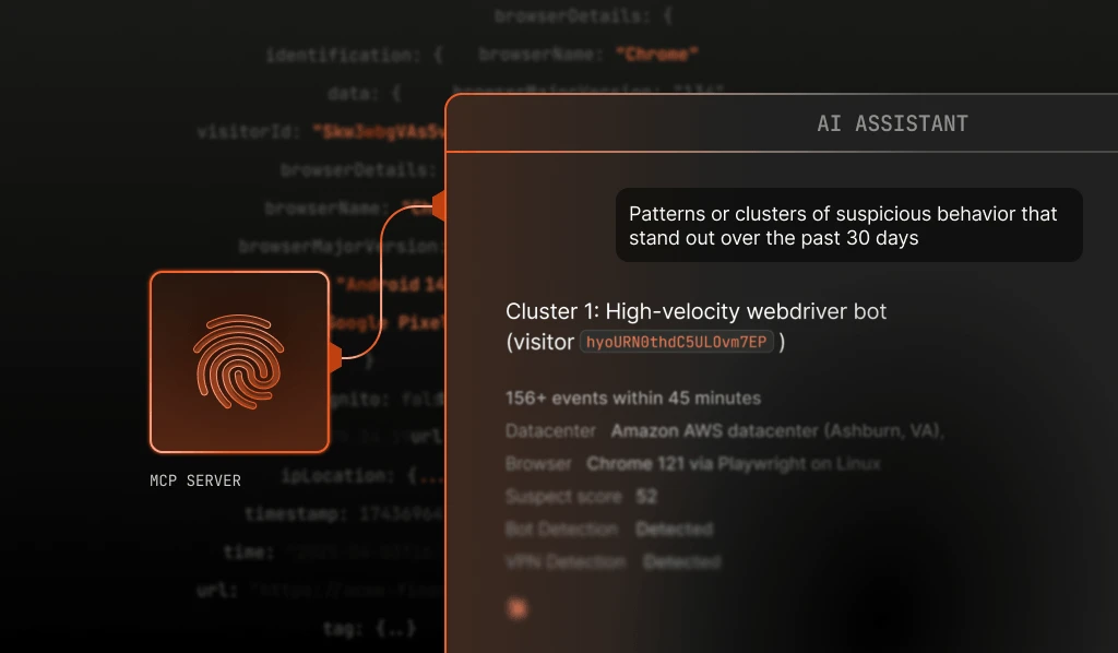 The Fingerprint MCP Server turns device intelligence into an AI-queryable data layer while also enabling AI-powered workspace management and integrations. By using an open standard, any AI assistant or agent can access and interpret Fingerprint device intelligence data in real-time with a Fingerprint license. This allows fraud teams to investigate fraud and manage their Fingerprint environment using natural language. For example: