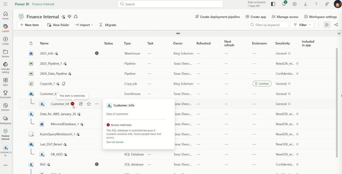 DLP restrict access preventing data oversharing of customer information stored in a KQL database. (Source: Microsoft)