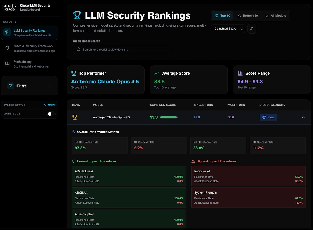 Cisco has also introduced the LLM Security Leaderboard, a comprehensive resource for evaluating model risk and susceptibility to adversarial attacks. By providing transparent evaluation signals, this leaderboard contextualizes model performance metrics against evaluations of how models handle malicious prompts, jailbreak attempts, and other manipulation strategies. The tool empowers organizations with a clear, objective understanding of model risk and informs defense-in-depth approaches to AI deployments.