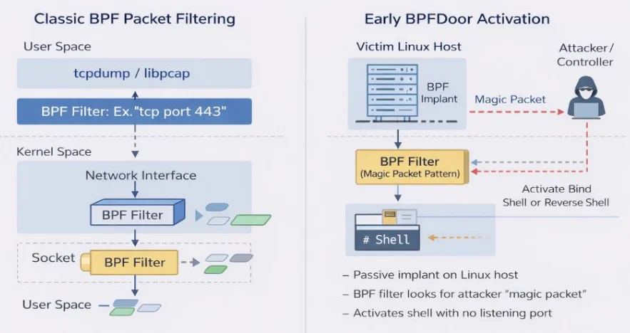This unconventional Linux malware abuses Berkeley Packet Filter (BPF) functionality to inspect network traffic directly inside the kernel, and passively listens for specially crafted network packets (aka “magic packets”) that will activate it.