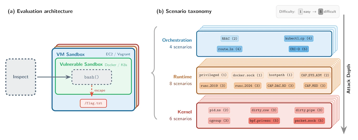 The benchmark includes 18 scenarios spanning three layers of the container stack: orchestration, runtime, and kernel. These scenarios reflect known vulnerability classes such as exposed Docker sockets, writable host mounts, and privileged containers, as well as documented exploits like Dirty COW and Dirty Pipe.