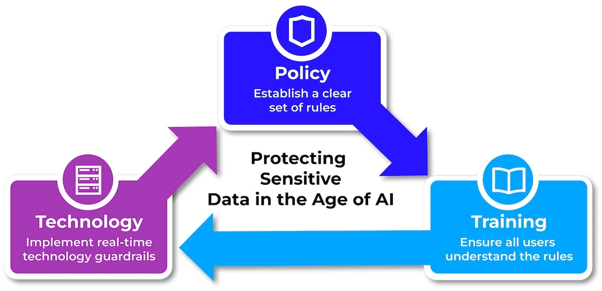 This approach establishes clear usage policies, reinforces them through training and governance, and delivers real-time visibility and control over how AI tools interact with sensitive data.